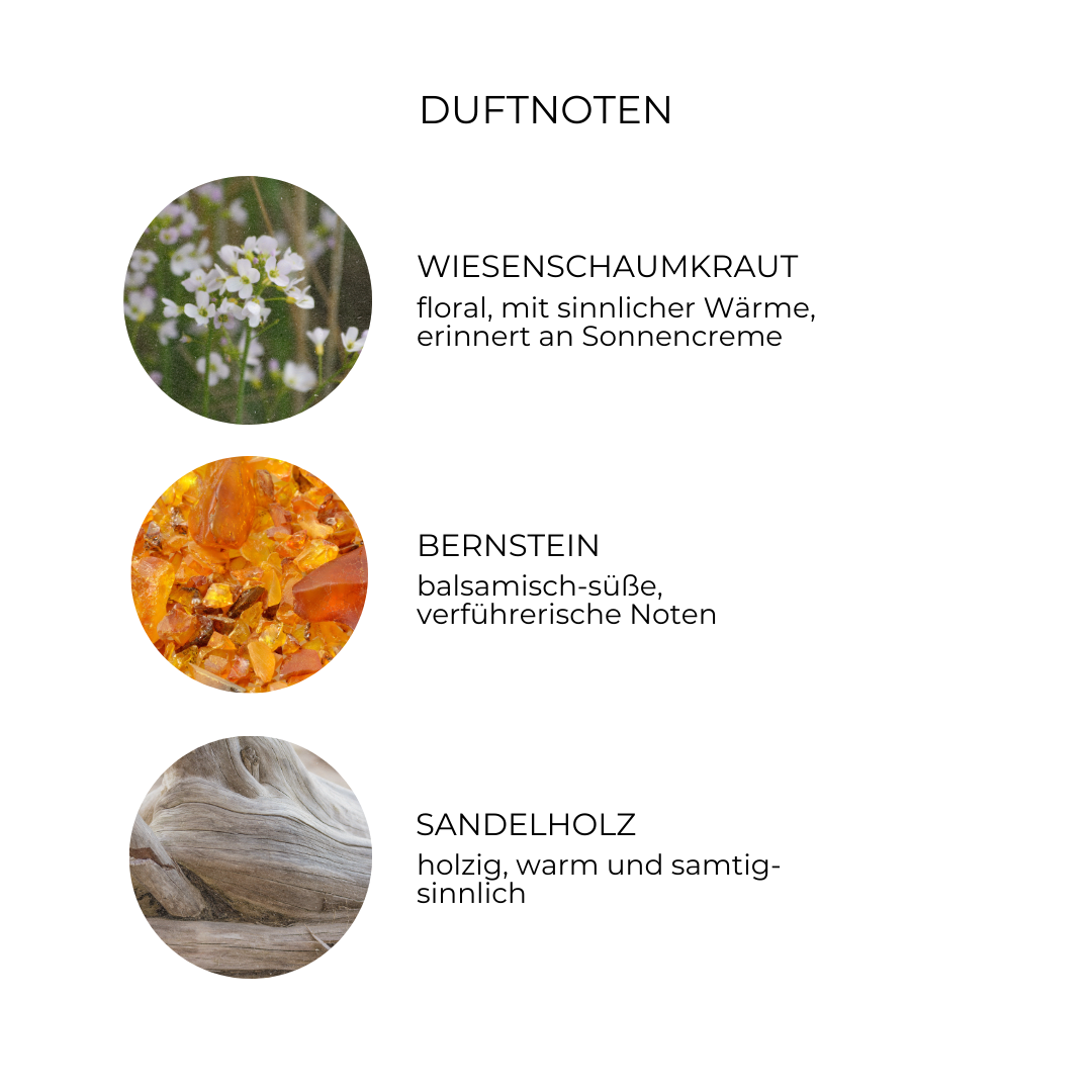 Abendlicht über Sylt, die Sonne sinkt, und alles wird wärmer, weicher, ruhiger. SUNDOWNER bringt diese Stimmung in Dein Zuhause: holzige Wärme, süßer Bernstein und eine Spur Sonnenöl, durchzogen von lauer Meeresluft, die wie ein Flüstern zu Dir kommt. Der Duft leuchtet sanft, wie die letzten Sonnenstrahlen – ein Moment zum Versinken, Sich-Hingeben und Einfach-Sein.