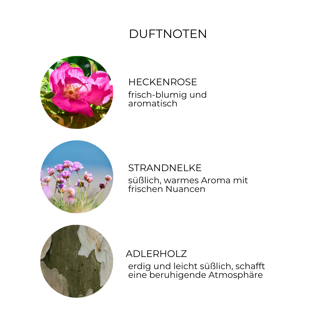 "Der Duft der Heckenrose, vermischt mit dem sanften Aroma der Strandnelke, erinnert mich an die Wege durch die Dünen zum morgendlichen Schwimmen. Dazu die salzige Brise und die ersten Sonnenstrahlen, die die Insel erwärmen. Dieses Gefühl von Ruhe und Leichtigkeit verströmt dieser tolle Duft bei jeder Handwäsche.”