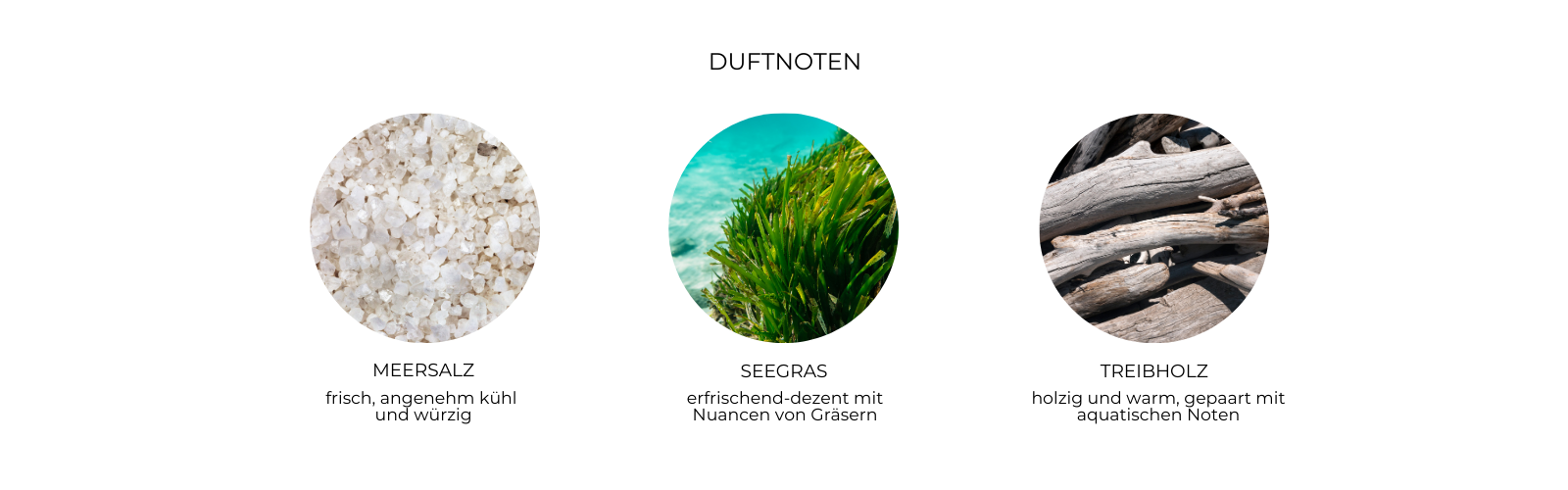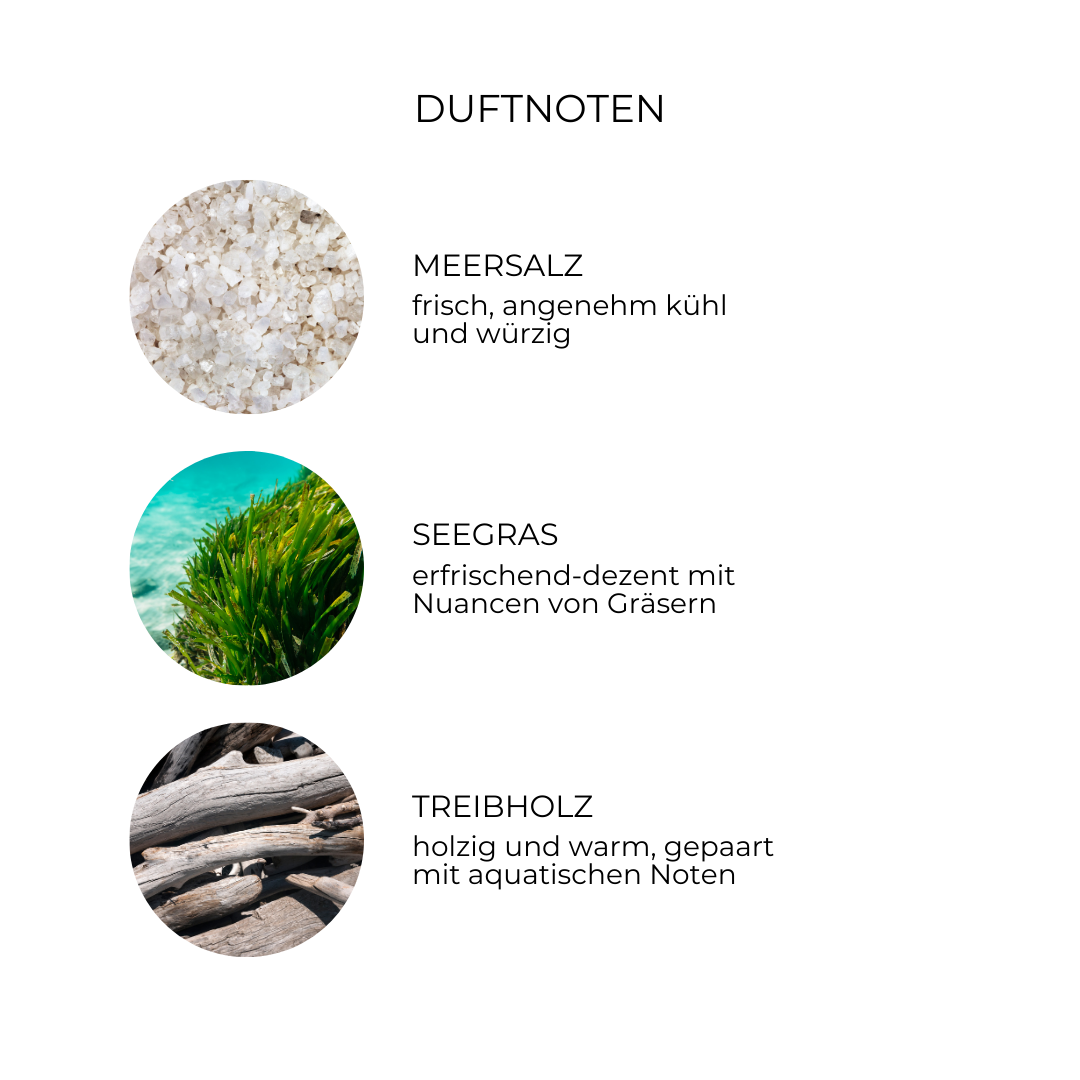 "Morgens ins Meer zu springen ist für mich der perfekte Start in den Tag. Der belebende Duft von salziger Meeresluft und Seegras erinnert mich an dieses erfrischende Gefühl, als würde ich direkt in die Wellen eintauchen. Klar, frisch und belebend – ein Duft, der mich jeden Tag an die Freiheit des Meeres erinnert.”